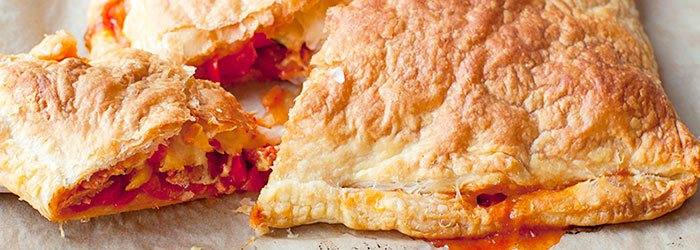 Papryki pokroić na ćwiartki i usunąć nasiona z komór. Pokroić na cienkie paski. Cebulę pokroić na półplasterki, kiełbaskę obrać i pokroić na plasterki. Rozgrzać oliwę w szerokim dużym garnku, dodać cebulę, kiełbasę oraz paprykę. Smażyć przez ok. 5 minut co chwilę mieszając. Dodać bulion oraz koncentrat pomidorowy i wymieszać. Gotować bez przykrycia przez ok. 15 minut na średnim ogniu, mieszając od czasu do czasu. Gdy cały płyn odparuje dodać posiekane liście bazylii i w razie potrzeby doprawić (zależy jak słony był bulion). Piekarnik nagrzać do 180 stopni C. Rozwałkowane ciasto francuskie położyć na blaszce do pieczenia wyścielonej pergaminem. Na jednej połowie ciasta wyłożyć nadzienie paprykowe, zostawiając wolny brzeg dookoła. Na wierzchu położyć plasterki sera żółtego. Nakryć drugą połową ciasta i dokładnie zlepić brzegi. Wstawić do piekarnika i piec przez ok. 30 minut aż ciasto będzie dobrze zrumienione. Odczekać ok. 5 minut przed pokrojeniem.